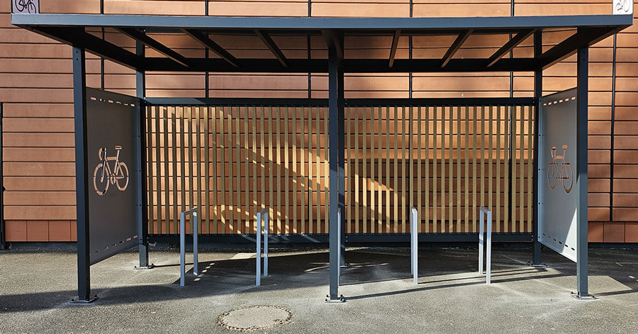 Les abris de cette série peuvent aussi inclure tous les accessoires nécessaires – arceaux, bornes de recharge VAE, stations de gonflage – ainsi qu’un espace fermé et sécurisé.