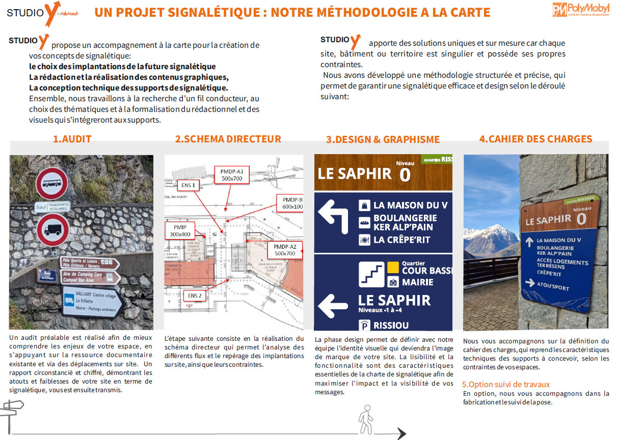 Polymobyl is one of the major players in the Rhône-Alpes signage market, and with good reason. We design, produce and install all types of supports: directional arrows and masts, signs, wall plaques, lecterns, totems, floor markers…