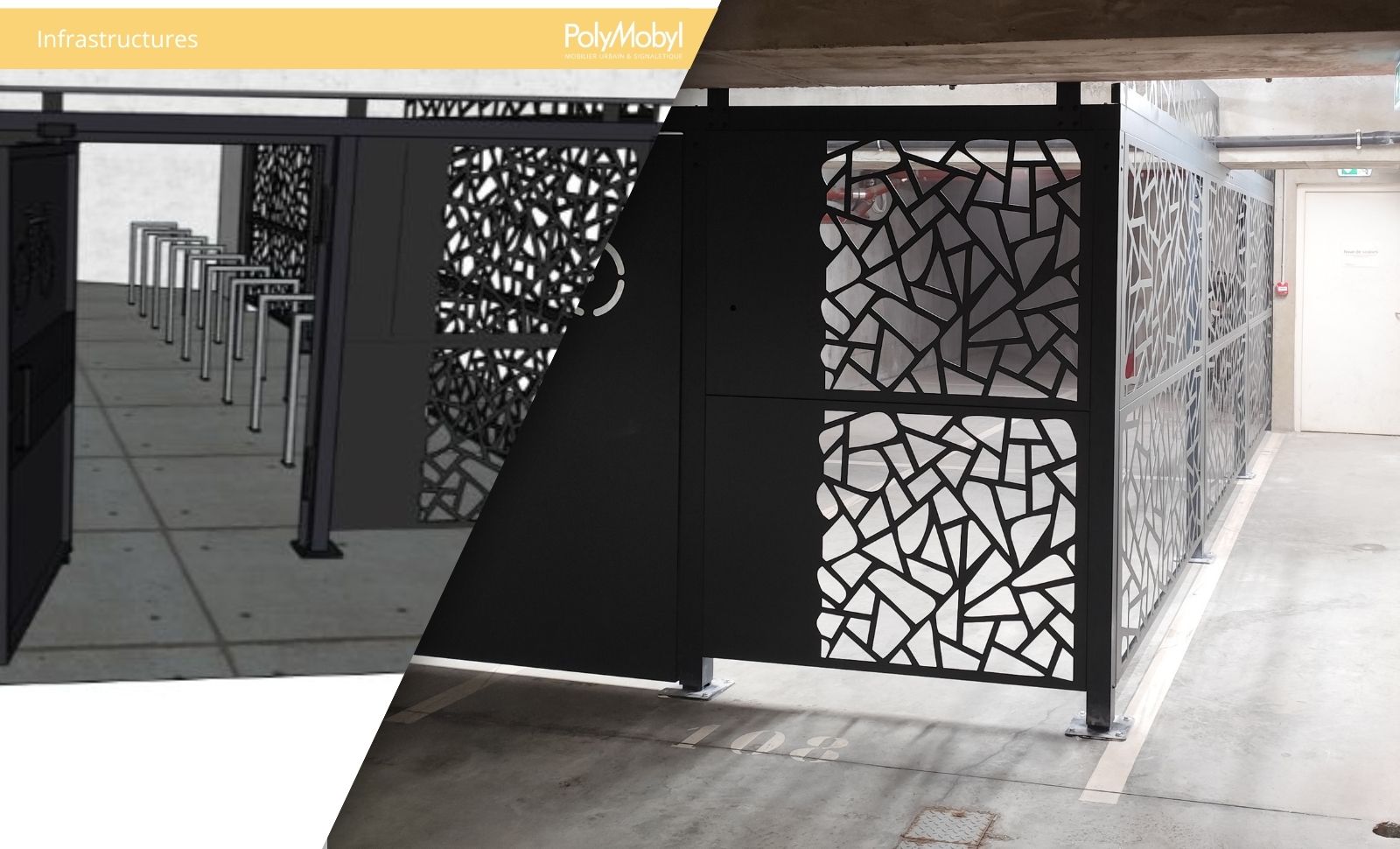 - Design inédit et harmonieux : Les cloisons de l’abri ont été finement ajourées avec un motif entièrement personnalisé. Peintes de la même couleur que la structure porteuse, elles offrent un rendu visuel cohérent et esthétique.